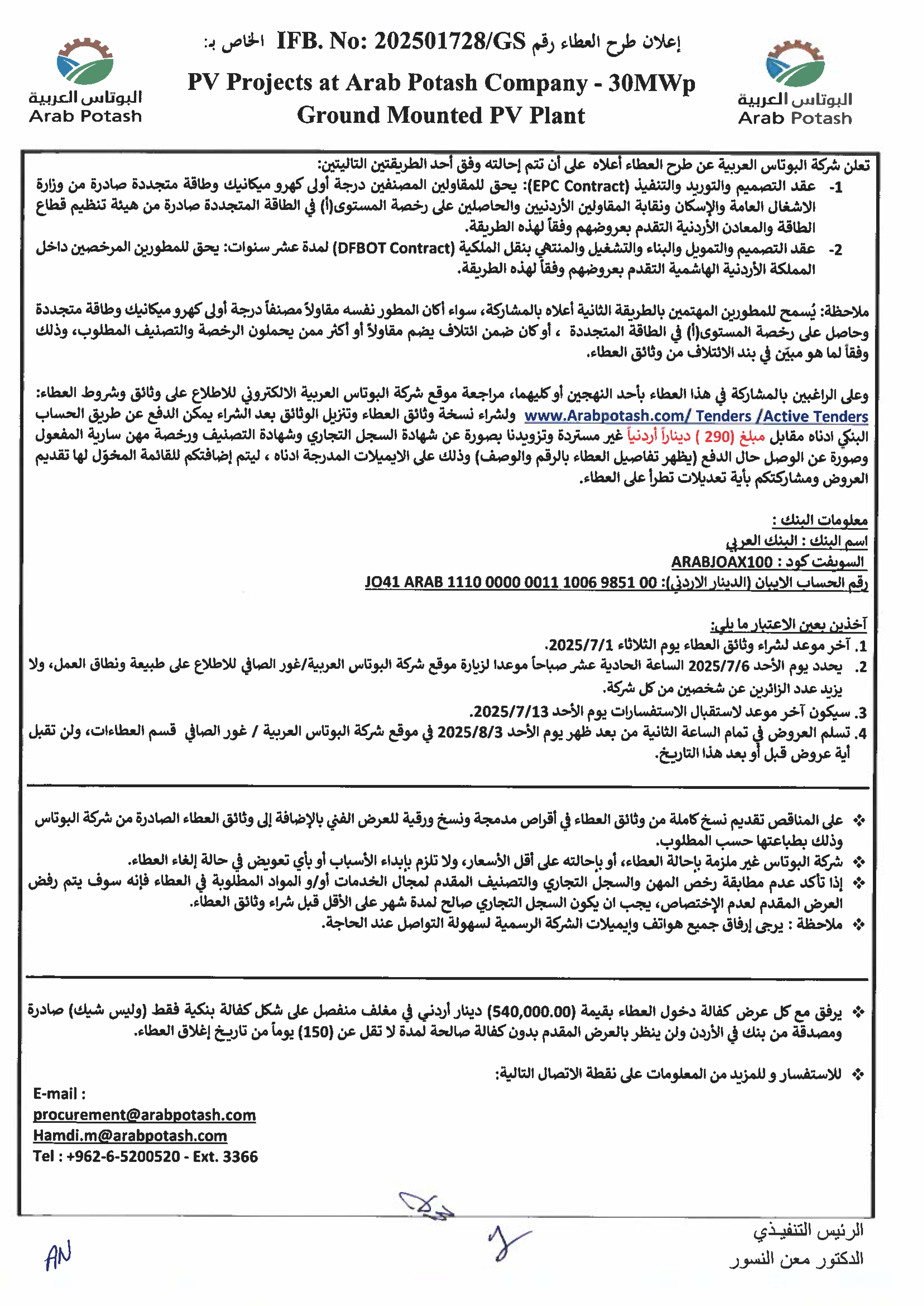 أعلنت شركة البوتاس العربية عن طرح عطاء لتنفيذ مشروع محطة طاقة شمسية كهروضوئية بقدرة 30 ميجاواط، على أن يتم ترسية العطاء وفقاً لأحد الخيارين التاليين: