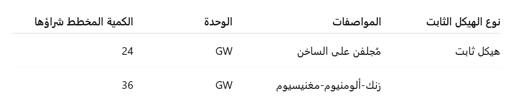 ستُبرم اتفاقيات إطارية مع الموردين المؤهلين لمدة عامين، على أن يتم اعتماد نتائج المناقصة كأساس للمشتريات الفعلية من قبل الشركات التابعة. ويشمل نطاق التوريد: تصميم وتصنيع وتوريد الهياكل الثابتة ومستلزماتها، إضافة إلى خدمات الفحص، والإرشاد في التركيب، وضمان الجودة والصيانة.