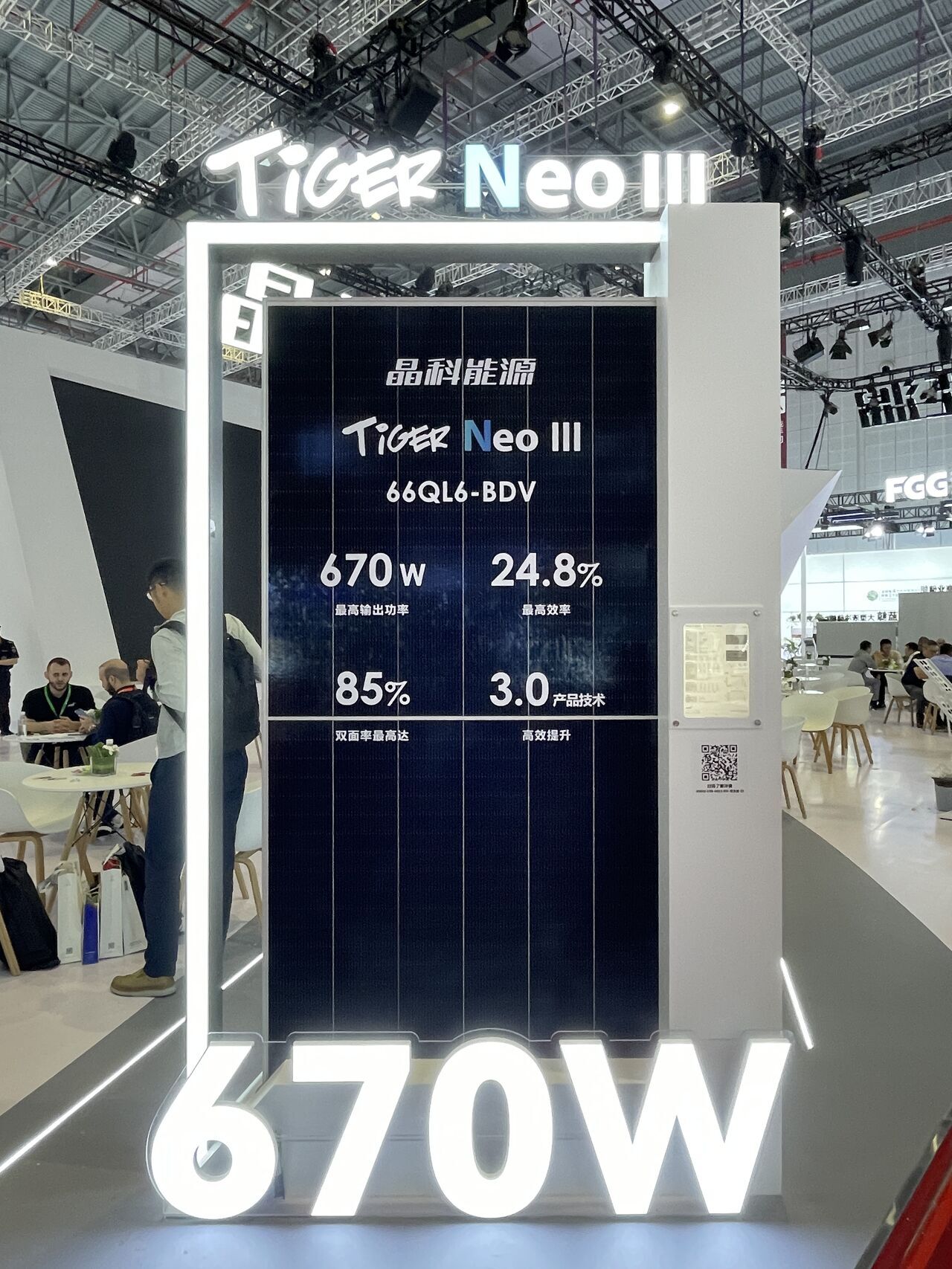 وخلال المعرض، عرضت جينكو سولار سلسلة Tiger Neo 3.0 الجديدة، بقدرة تصل إلى 670 واط وكفاءة 24.8%، ومعامل كفاءة الوجهين “Bifaciality” تساوي 85%. وتعتمد الألواح على تقنيات متعددة مثل 20BB وMAX وHCP وFP، إلى جانب تحسينات في التصميم والبنية، مما يقلل من الخسائر البصرية والكهربائية ويزيد من متانة المنتج وعمره التشغيلي. ومن المتوقع أن تكون هذه السلسلة متاحة للطلب في الربع الرابع من العام الجاري.