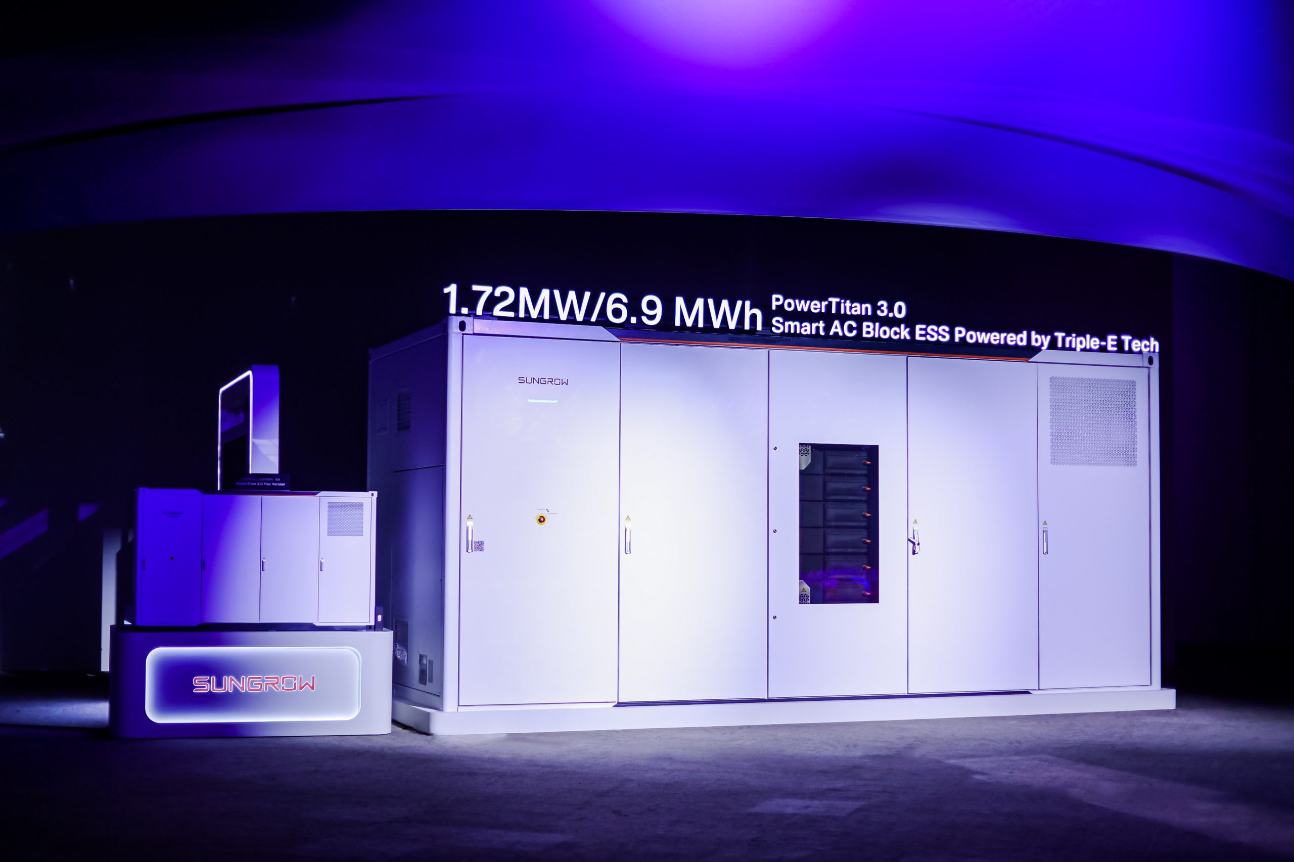قدمت شركة صن جرو “Sungrow” نظام PowerTitan 3.0 AC المبرّد بالكامل بالسائل، بقدرة تشغيلية من ساعتين إلى أربع ساعات. وفي تكوينه داخل حاوية 20 قدمًا، يدمج النظام محوّل PCS بقدرة 1.72 ميجاواط مع بطاريات بسعة 6.9 ميجاواط ساعة، مما يرفع قدرة بلوك واحد يصل إلى 6.9 ميجاواط وسعة 27.6 ميجاواط ساعة.