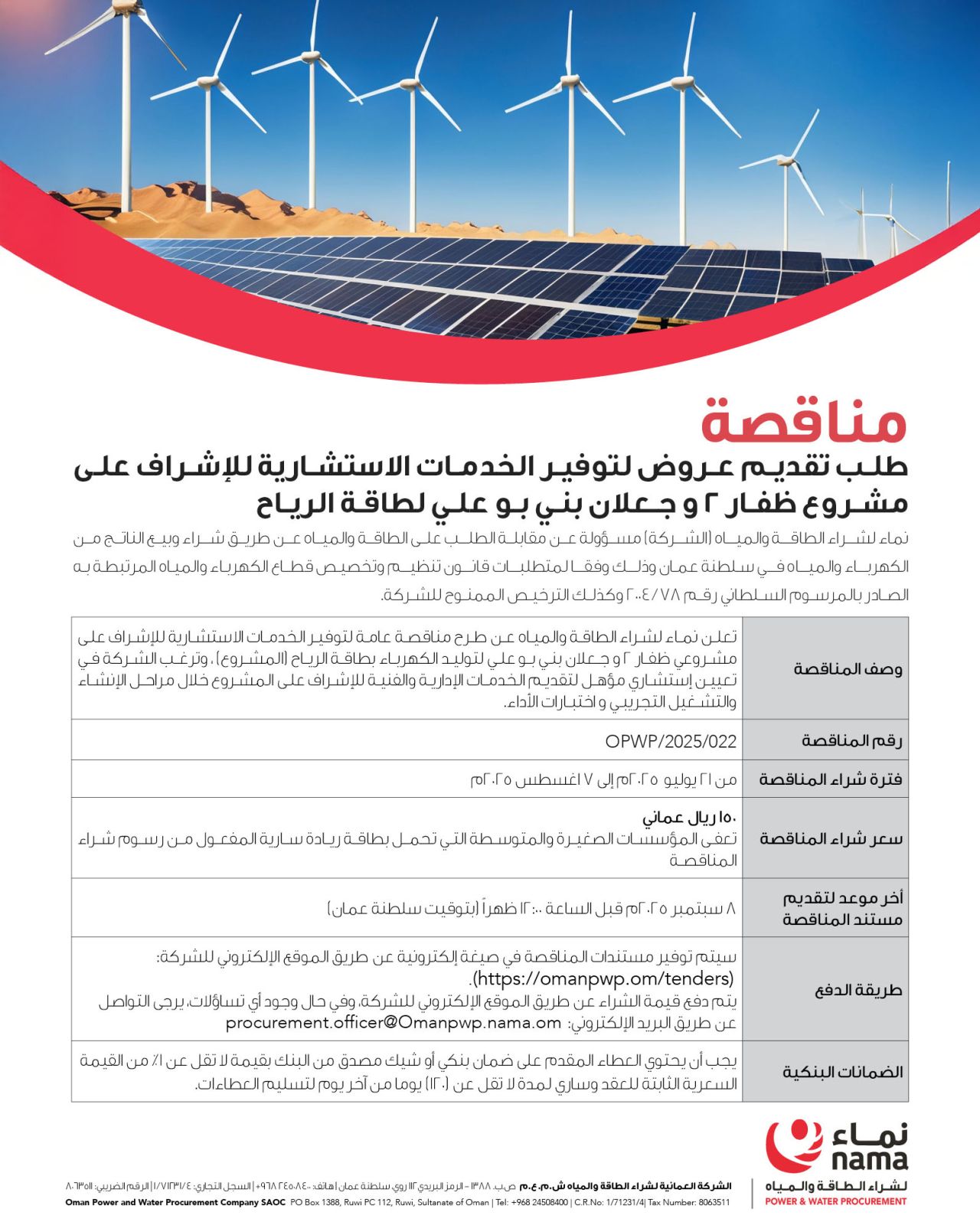 ودعت الشركة الراغبين في المشاركة إلى زيارة موقعها الإلكتروني للاطلاع على مستندات المناقصة والتسجيل الإلكتروني، كما خصصت البريد الإلكتروني procurement.officer@omanpwp.nama.om للرد على الاستفسارات الفنية والإدارية المتعلقة بالمناقصة.
