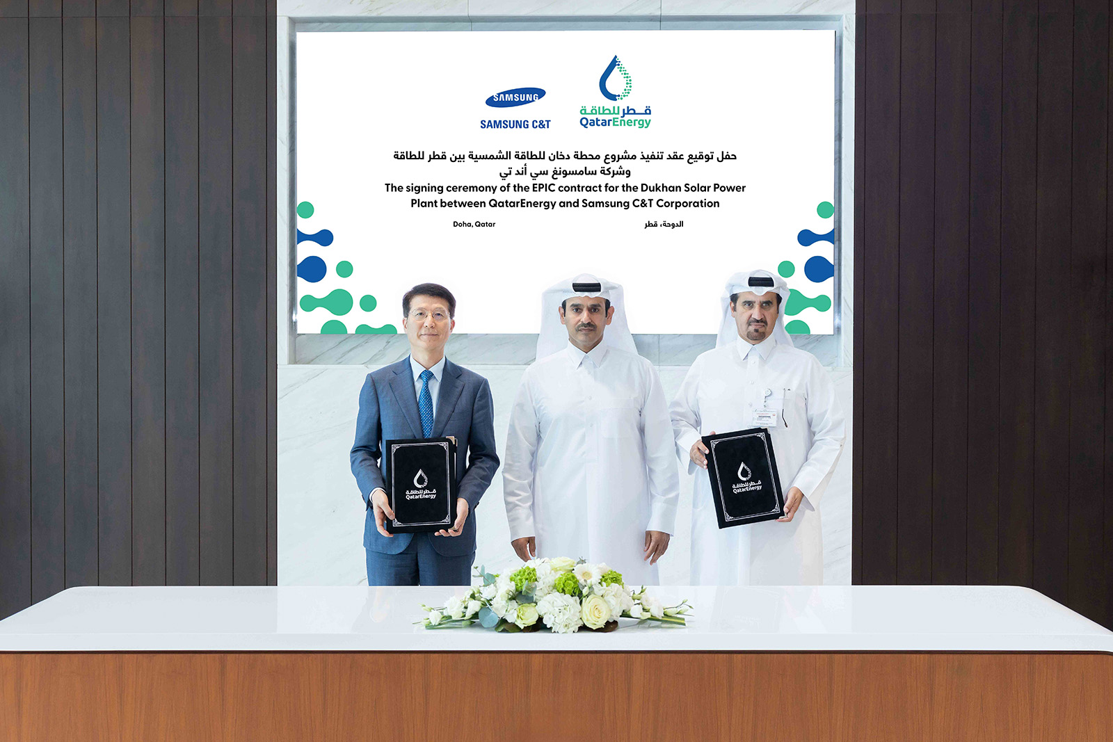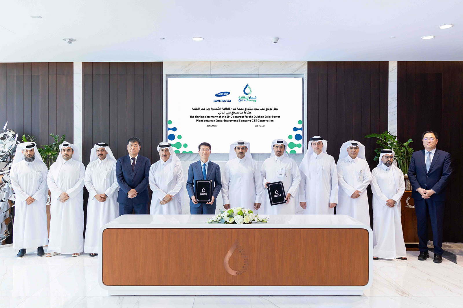 وقّعت شركة قطر للطاقة اتفاقية مع مجموعة سامسونغ سي آند تي “C&T” للهندسة والإنشاء لتنفيذ مشروع محطة الدوحة للطاقة الشمسية، التي تُعد واحدة من أكبر محطات الطاقة الشمسية في العالم، وتقع على بُعد نحو 80 كيلومتراً غرب العاصمة الدوحة.