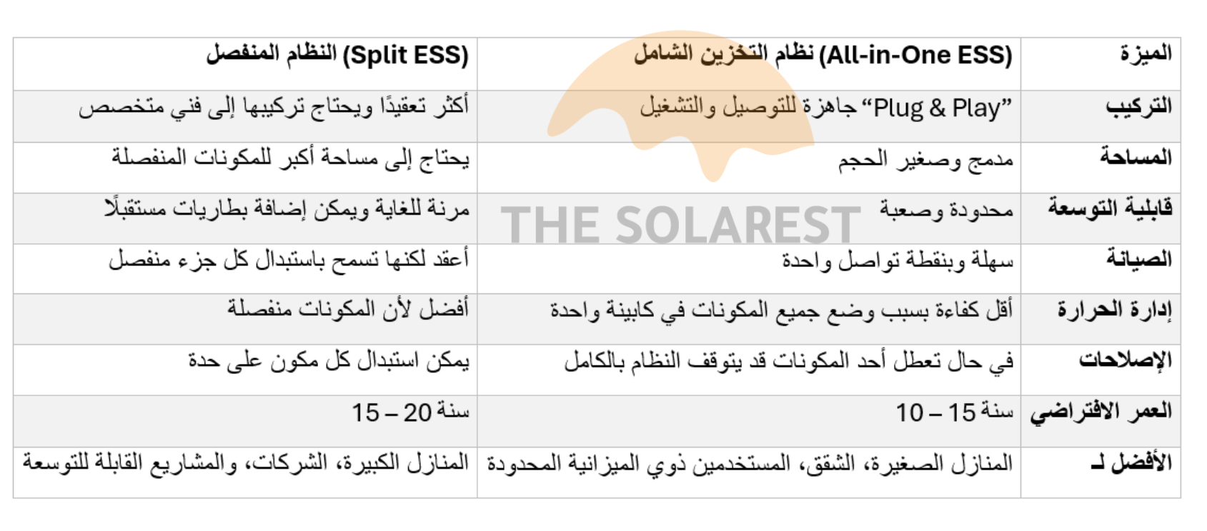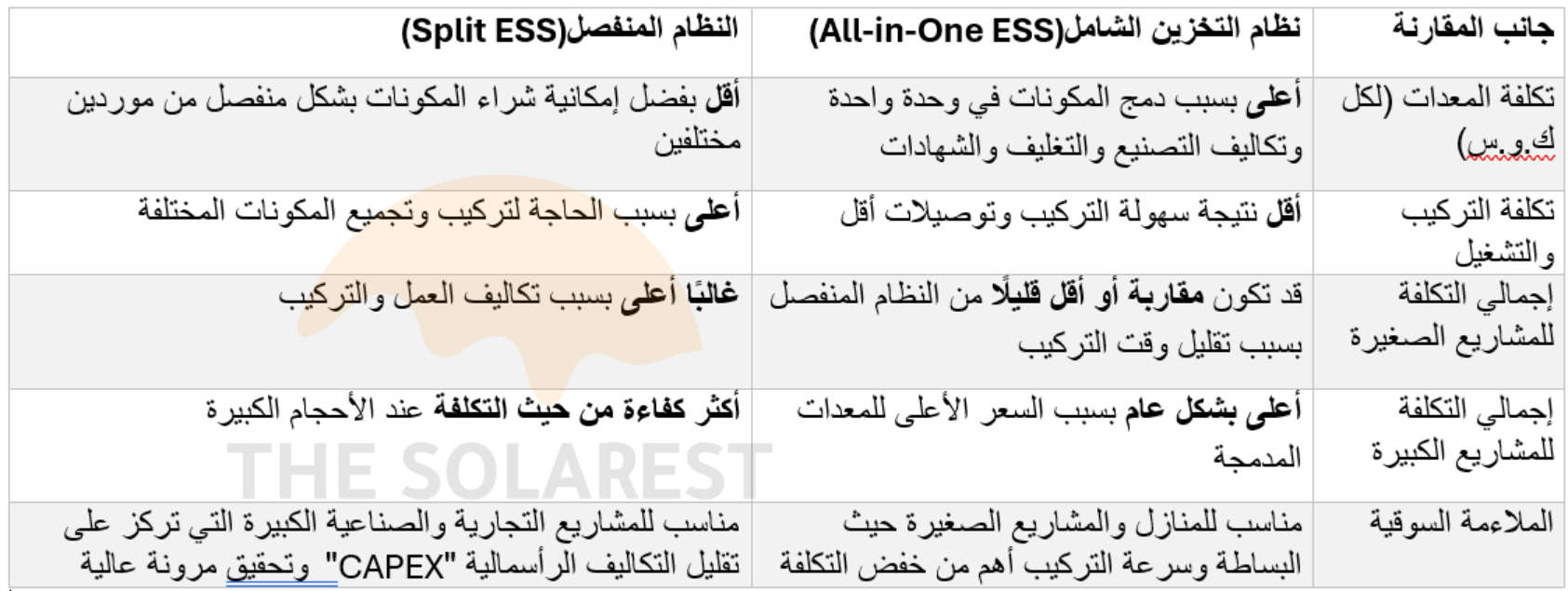 الآن، سنقارن بين النظام الشامل (All-in-One ESS) والنظام المنفصل (Split ESS) من ناحيتين رئيسيتين:
